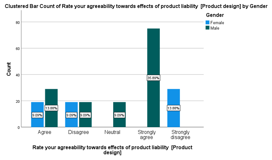 DISCUSSION: Figure 1: The figure indicates that nearly half of the respondents were male (44.98%) and stated “yes.” It suggests that a significant portion of male respondents agrees with or supports a specific aspect, which needs to be specified further for a complete understanding of the context. Figure 2: The figure reveals that the largest group of respondents (22.97%) in the age range of 31-40 reported that a customer was disappointed with the color of a product ordered online. This finding highlights the relevance of product appearance and customer expectations in e-commerce transactions, indicating a potential concern related to product liability and consumer satisfaction. Figure 3: Among the respondents with an undergraduate (UG) qualification, the majority (26.79%) strongly disagreed with the regulatory framework. This indicates that a significant portion of UG respondents hold a negative perception of the existing regulations concerning product liability and consumer protection in e-commerce. Further investigation is necessary to understand the specific concerns and potential recommendations for improvement. Figure 4: In contrast to Figure 3, the figure shows that the majority of high school respondents (22.97%) strongly agree with globalization. This suggests a positive perception among high school respondents regarding the impact of globalization on product liability and consumer protection in the e-commerce context. The reasons behind this agreement require further exploration. Figure 5: The figure indicates that the majority of UG respondents (22.97%) remained neutral regarding market competition. This suggests a lack of strong opinions or a need for more information among UG respondents regarding the influence of market competition on product liability and consumer protection in e-commerce. Figure 6: Similar to Figure 5, the majority of high school respondents (22.97%) remained neutral. This indicates a similar trend of neutrality among high school respondents regarding the impact of market competition on product liability and consumer protection. Figure 7: The figure shows that the majority of high school respondents (22.97%) also remained neutral regarding technological advancements. This suggests that high school respondents may require more information or have mixed opinions regarding the influence of technological advancements on product liability and consumer protection. Figure 8: Among male respondents, the majority (22.97%) strongly agrees with safety. This indicates a positive perception among male respondents regarding the importance of safety measures in product liability and consumer protection. Figure 9: The figure indicates that most male respondents (26.79%) strongly disagreed with litigation cost. This suggests that male respondents perceive litigation costs as burdensome or unfavorable in the context of product liability and consumer protection. Figure 10: The majority of male respondents (35.89%) strongly agrees with product design. This highlights the importance of product design in the eyes of male respondents concerning product liability and consumer protection. Figure 11: Similarly, most male respondents (35.89%) strongly agree with insurance premium. This suggests that male respondents recognize the significance of insurance coverage in addressing product liability concerns. Figure 12: Among male respondents, the majority (22.97%) agrees with innovation. This indicates a positive perception among male respondents regarding the role of innovation in improving product liability and consumer protection in e-commerce. Figure 13: Lastly, the majority of male respondents (26.79%) strongly agree with consumer trust. This underscores the importance of establishing and maintaining consumer trust in the e-commerce landscape from the perspective of male respondents.