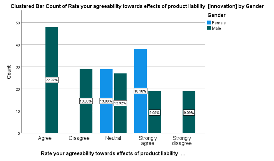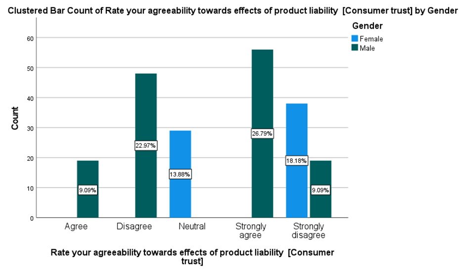 The study on the examination of legal issues surrounding product liability and consumer protection in the age of e-commerce sheds light on several important aspects. Through the analysis of various figures, several key findings emerge. Firstly, it is evident that male respondents constituted a significant portion of the survey participants. Their responses highlight their perspectives on different aspects related to product liability and consumer protection. Secondly, the study reveals that customers’ dissatisfaction with product color was a common issue reported by respondents, particularly those in the age range of 31-40. This emphasizes the significance of product appearance and meeting customer expectations in e-commerce transactions, indicating a potential area for improvement in terms of consumer satisfaction and product liability. The survey also brings attention to the contrasting opinions regarding the regulatory framework. While a significant portion of respondents with an undergraduate qualification strongly disagreed with the regulatory framework, high school respondents expressed a strong agreement with globalization. This disparity suggests the need for a deeper examination of specific concerns and potential reforms regarding the existing regulations in the context of e-commerce. The figures also indicate a general trend of neutrality among respondents, both in terms of market competition and technological advancements. This suggests a requirement for further information and education on these topics to shape informed opinions and enhance understanding of their impact on product liability and consumer protection. Regarding gender-specific responses, male respondents exhibited positive attitudes towards safety, product design, insurance premium, innovation, and consumer trust. Conversely, they expressed strong disagreement with litigation costs. These findings emphasize the significance of safety measures, product design, insurance coverage, innovation, and consumer trust from the male respondents’ perspective in the realm of product liability and consumer protection. Overall, the study provides valuable insights into the legal issues surrounding product liability and consumer protection in the age of e-commerce. It identifies key areas of concern, highlights disparities in opinions, and suggests potential areas for improvement. The findings can guide policymakers, legal professionals, and businesses in enhancing consumer protection measures, addressing product liability concerns, and fostering a more transparent and trustworthy e-commerce environment.