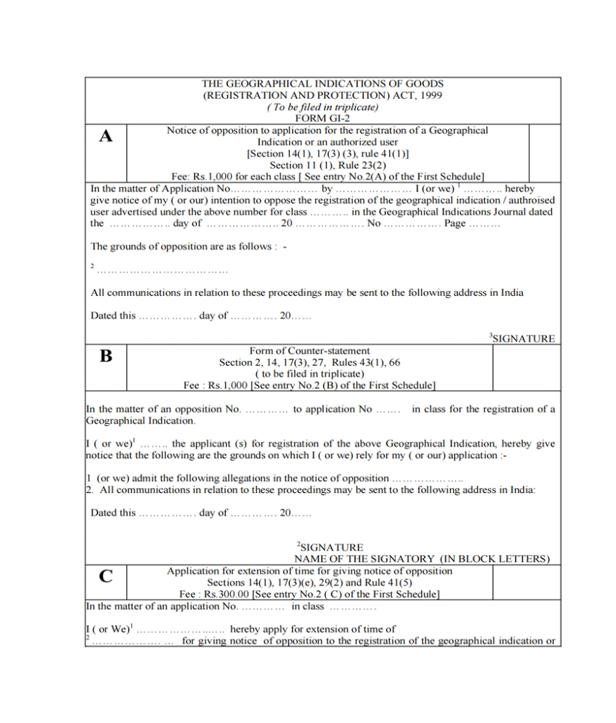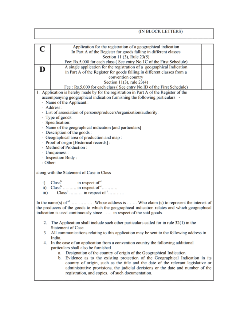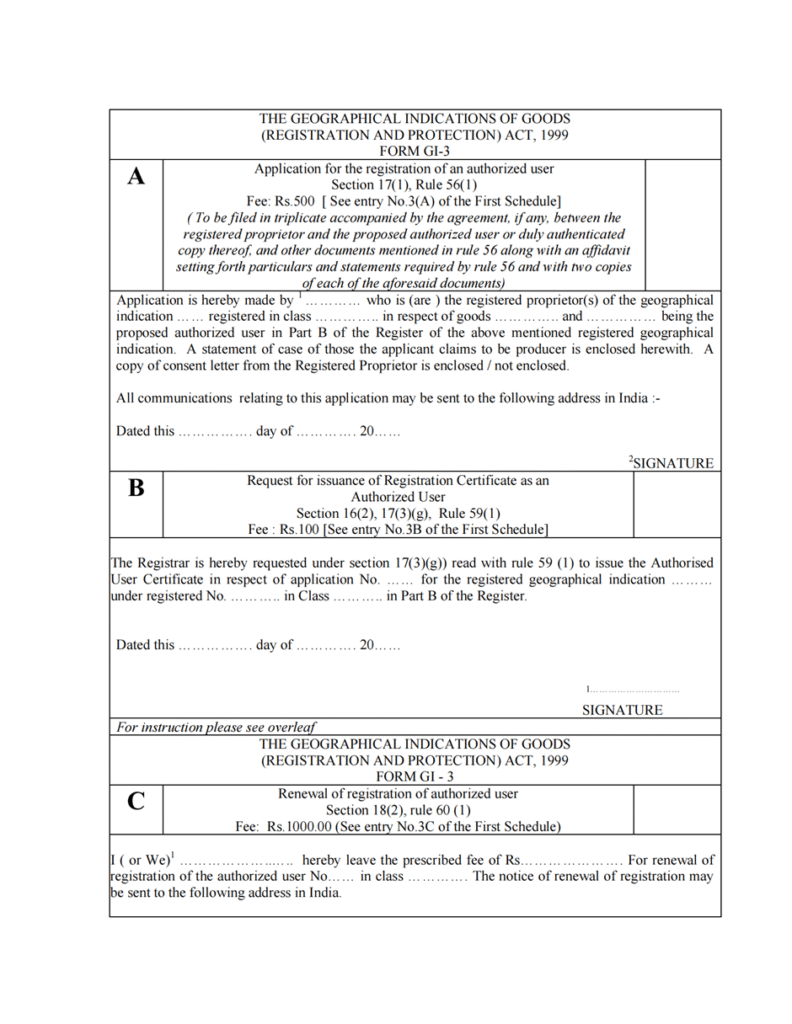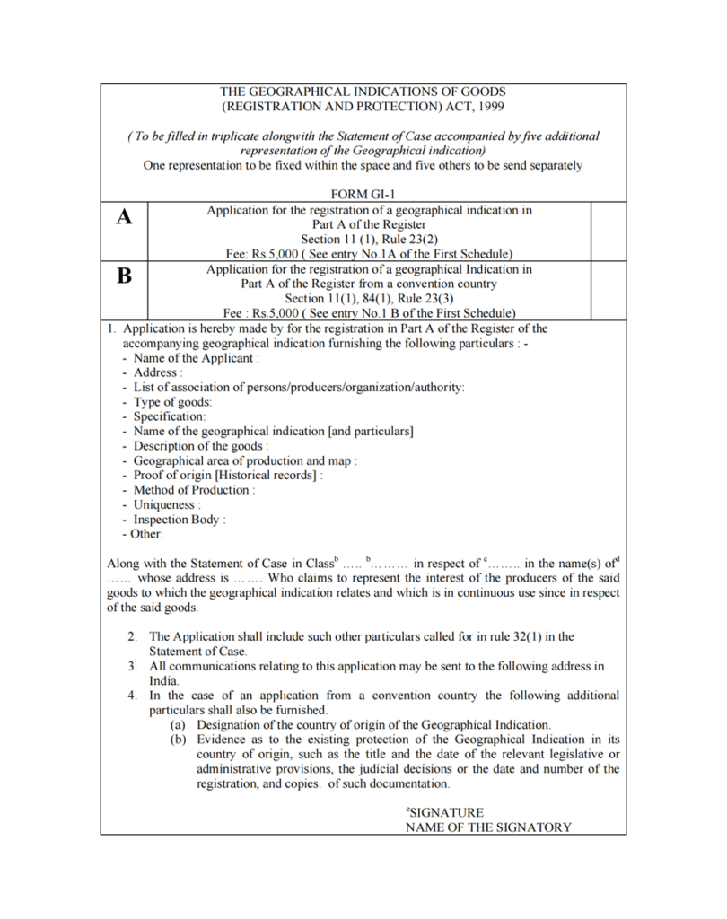 [63] Geographical Indications Registry, Form GI–1: Application for the Registration of a Geographical Indication, under the Geographical Indications of Goods (Registration and Protection) Act, 1999, (Department for Promotion of Industry and Internal Trade, Ministry of Commerce and Industry, Govt. of India), available at https://ipindia.gov.in/geographical-indications.htm (last visited Oct. 28, 2025).